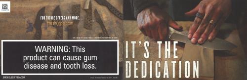 Direct mail from Copenhagen received in July 2017 that promotes the mint product line and delivers coupons. Imagery is of a bearded man sharpening knives. Directs the recipient to the brand website for future offers and more. Text: "It's the dedication that makes the work the reward."
