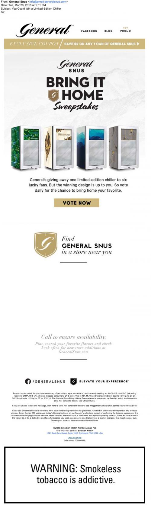 Email from General Snus in March 2018 promoting the Bring It Home sweepstakes, where participants have a chance to win a limited-edition chiller by voting on the designs. Also links to the brand website to use the store locator.