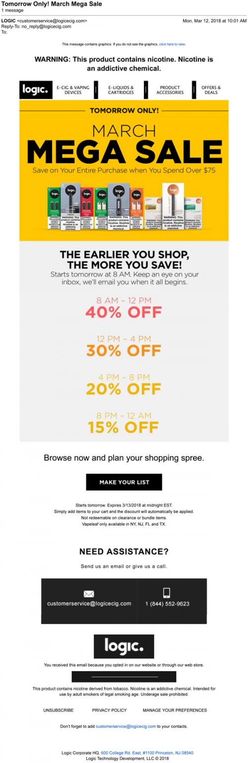 Email from Logic in March 2018 promoting a March Mega Sale through the brand website on purchases made during specific hours of the day.