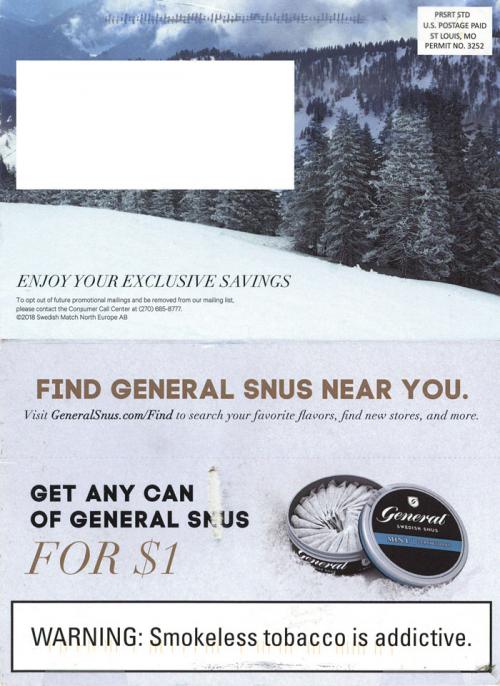 Direct mail from General Snus in April 2018 delivering a coupon and promoting the website and the brand presence on social media.