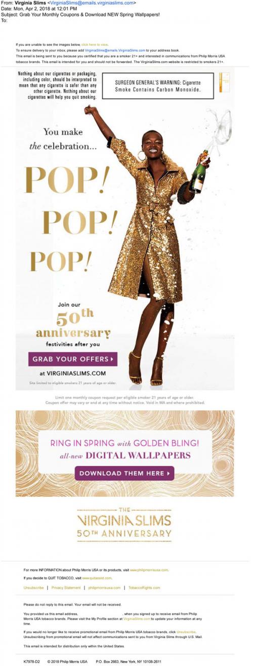 Email from Virginia Slims in April 2018 inviting the recipient to claim coupons and join the 50th anniversary celebration on the brand website. Offers digital wallpapers for download.