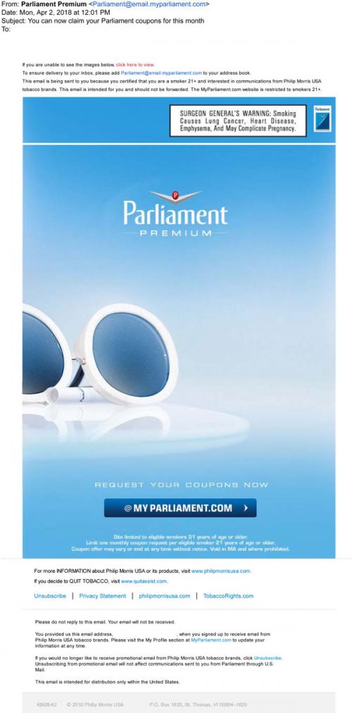 Email from Parliament in April 2018 directing the recipient to claim monthly coupons on the brand website.