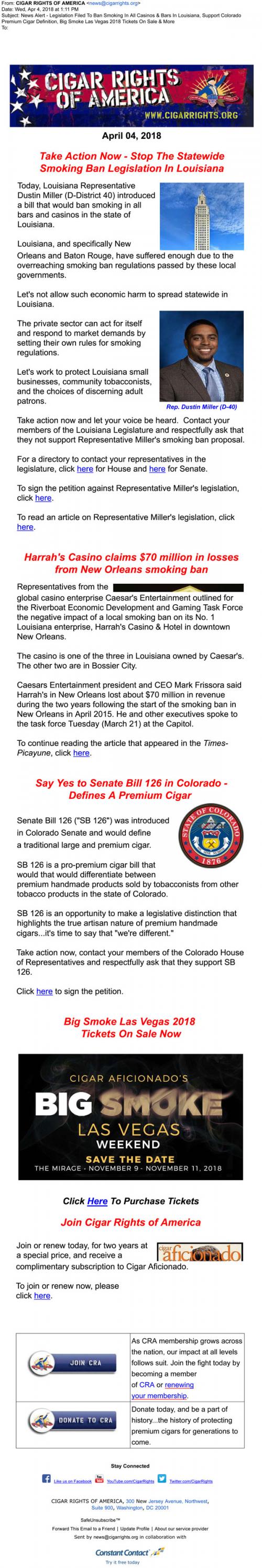 Email from Cigar Rights of America in April 2018 announcing pressing legislation concerning a smoking ban in bars and casinos in Louisiana, and how to sign a petition or contact representatives. Other news includes Colorado's definition of a "premium cigar" and how to sign a petition supporting that bill. Announces an upcoming Big Smoke Las Vegas event and solicits for memberships and donations.