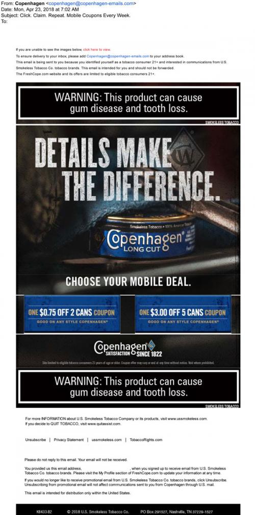 Email from Copenhagen in April 2018 reading "Details make the difference" and highlighting their mint products, while giving the recipient a choice between two mobile coupon offers to claim.