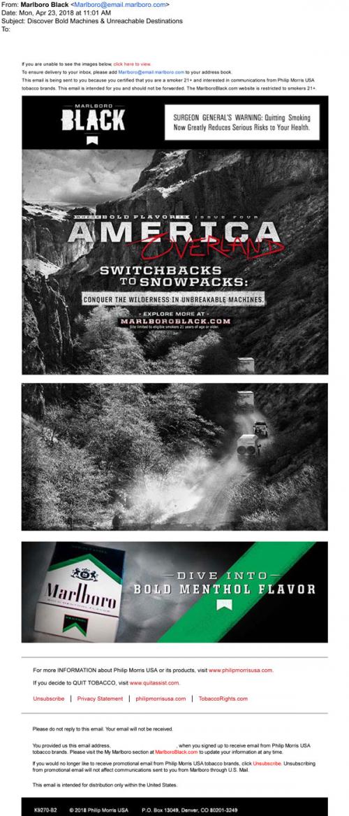 Email from Marlboro Black in April 2018 introducing issue four of America Overland, describing road trips through the wilderness. Also promotes Bold Menthol.
