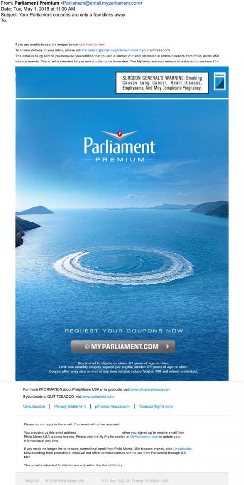Email from Parliament in May 2018 providing a link to request direct mail coupons on the brand website.