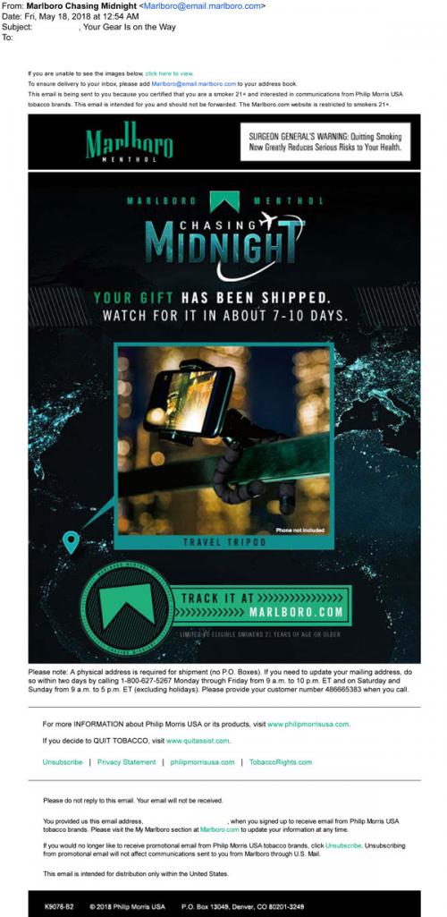 Email sent by Marlboro in May 2018 letting the recipient know that their free gift of a travel tripod as promotion for the Chasing Midnight sweepstakes is in the mail. Provides a link to the brand website to track the delivery of the item.