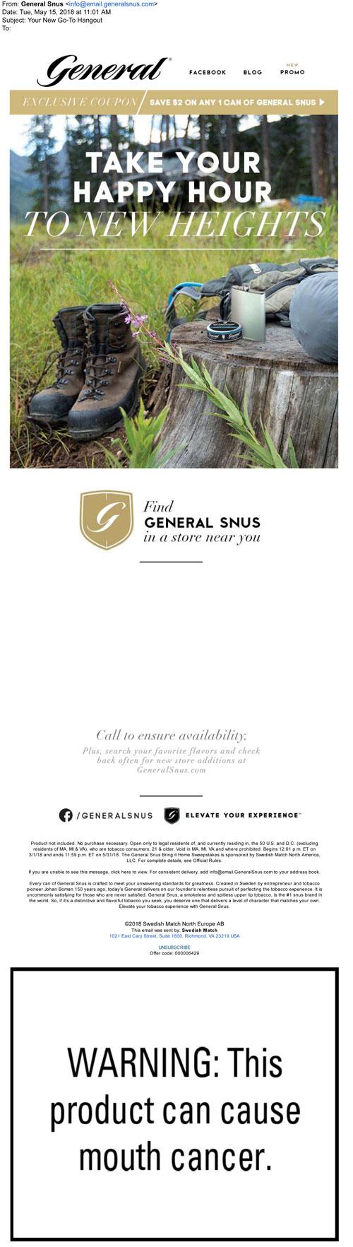 Email from General Snus in May 2018 showing their product in a hiking scene with the copy, "Take your happy hour to new heights." Includes a link to claim coupons on the brand website and some nearby retail locations based on the customer's address.
