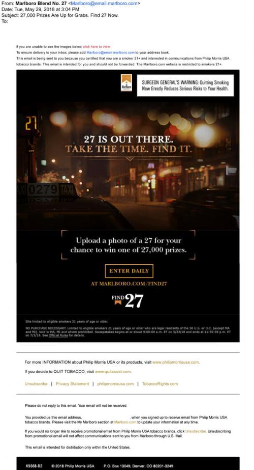 Email from Marlboro in May 2018 introducing the Find 27 sweepstakes with instructions on how to enter by uploading a photo of a 27 for the chance to win. Links to the brand website to enter daily.
