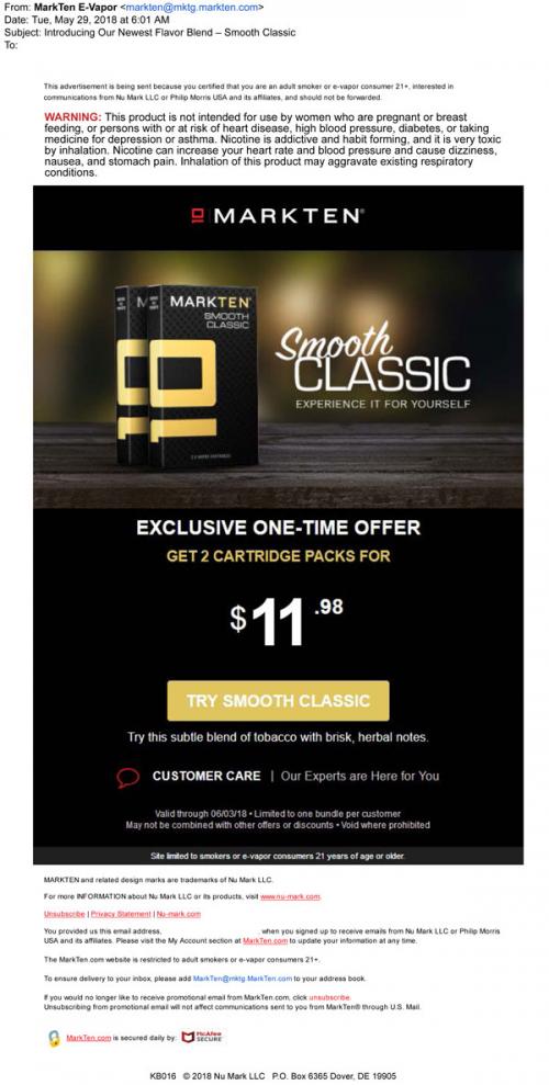 Email from MarkTen in May 2018 introducing the newest flavor, Smooth Classic, with a special online offer. Links to the brand website to purchase.