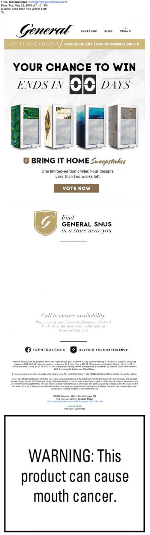 General Snus email from May 2018 reminding the recipient that the Bring It Home sweepstakes is ending soon, with a link to vote on a chiller design to win it. Also provides some nearby retail locations.
