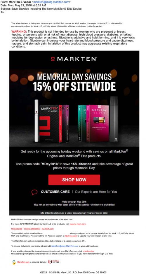 Email from MarkTen in May 2018 announcing a Memorial Day sale. Includes a discount promo code to use when shopping on the brand website. The image includes the original product style and the new Elite device.