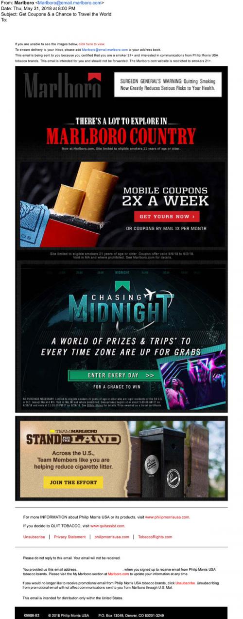 Email from Marlboro in May 2018 linking to claim weekly mobile or monthly direct mail coupons. Also promotes the Chasing Midnight sweepstakes with a reminder to enter daily, and the Team Marlboro Stand for the Land conservation projects to reduce cigarette litter.