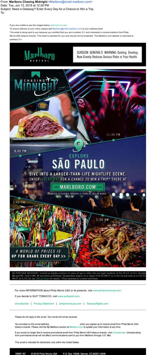 Email from Marlboro Menthol in June 2018 promoting the Chasing Midnight sweepstakes, with a link to the brand website to enter.