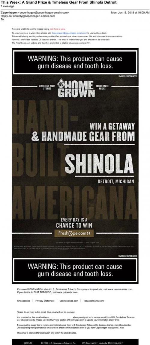 Email from Copenhagen in June 2018 linking to enter the Home Grown sweepstakes on the brand website.