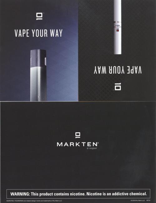 Direct mail from MarkTen received in June 2018 that promotes both their original style device and the new Elite pod-based system. Pictures the different flavors available and includes both coupons and online exclusive deals.