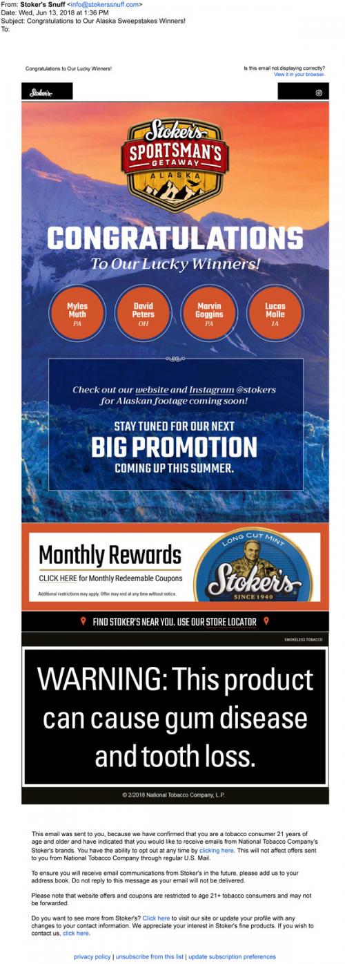 Stoker's email from June 2018 congratulating the winners of the Sportsman's Getaway trip to Alaska. Provides a link to claim monthly coupons, to use a store locator, and to check out the brand's social media account on Instagram. Reminds the recipient to "stay tuned" for the next promotion starting in the summer.