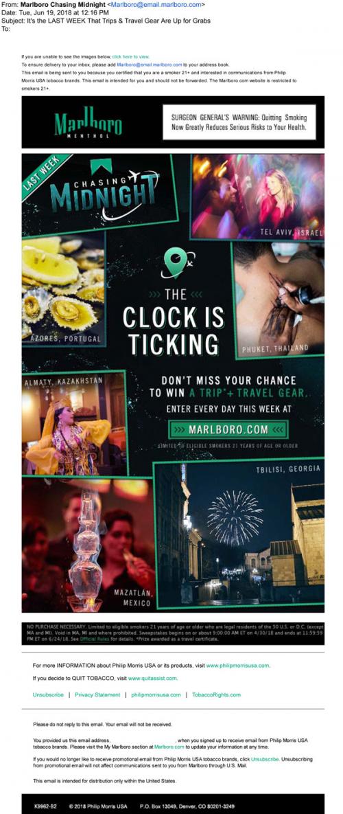Email from Marlboro Menthol in June 2018 promoting the last week of the Chasing Midnight sweepstakes, with a link to the brand website to enter and a reminder to enter every day for more chances to win.
