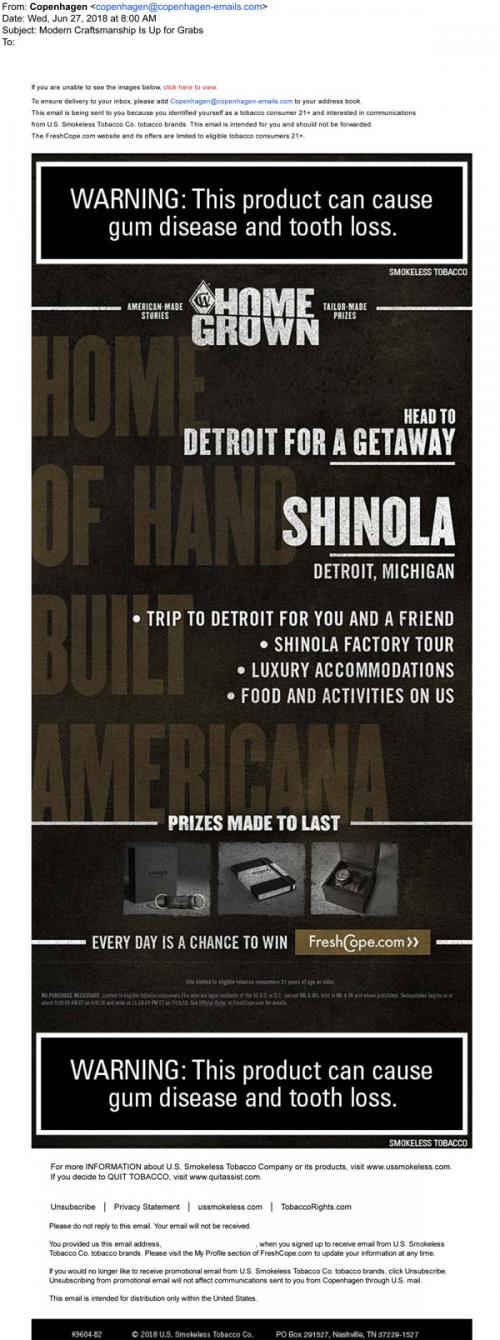 Email from Copenhagen in June 2018 linking to enter the Home Grown sweepstakes on the brand website. Shows some possible prizes available to win.