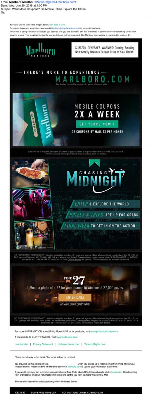 Marlboro Menthol email from June 2018 reminding the recipient to claim weekly mobile coupons or monthly direct mail coupons. Also promotes the Chasing Midnight sweepstakes and the Find 27 sweepstakes, with links to the brand website to enter both giveaways.