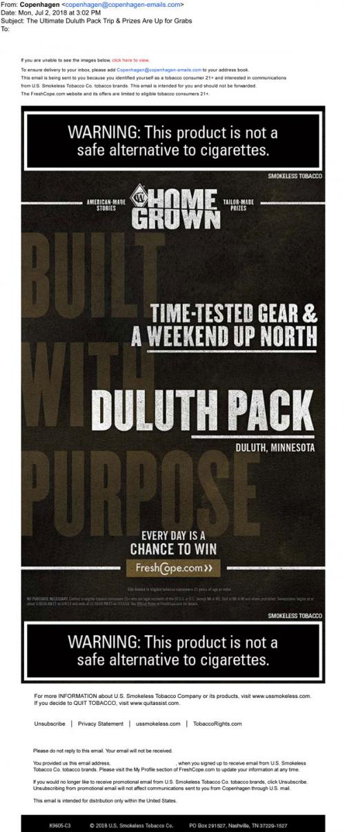 Email from Copenhagen in July 2018 promoting the Home Grown sweepstakes, with a link to the brand website to enter.