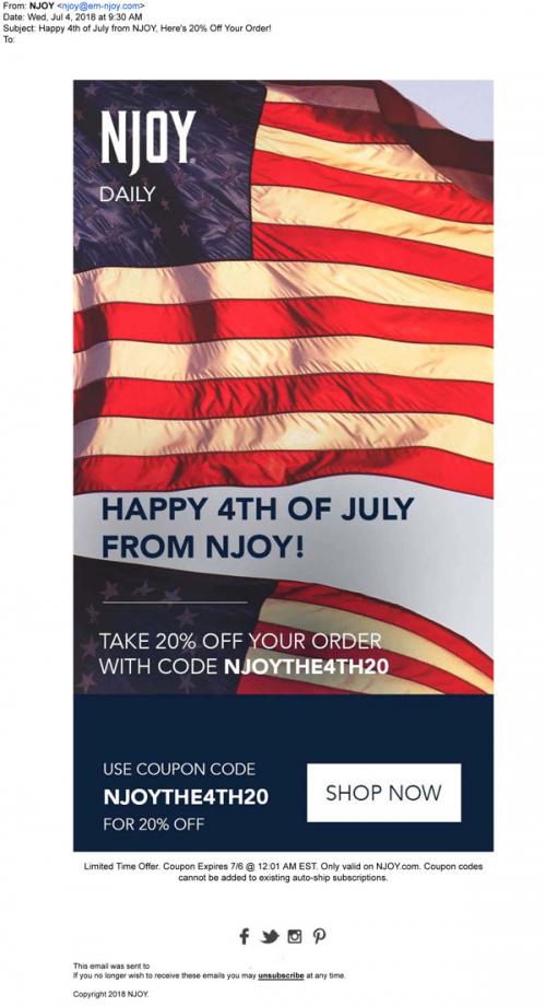 NJOY email from July 2018 wishing the recipient a happy fourth of July/Independence Day with a promo code to get a discount off orders made through the brand website.