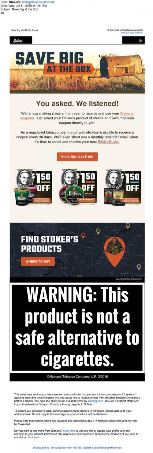 Email from Stoker's in July 2018 providing a link to claim coupons on the brand website. Also includes a link to a store locator.