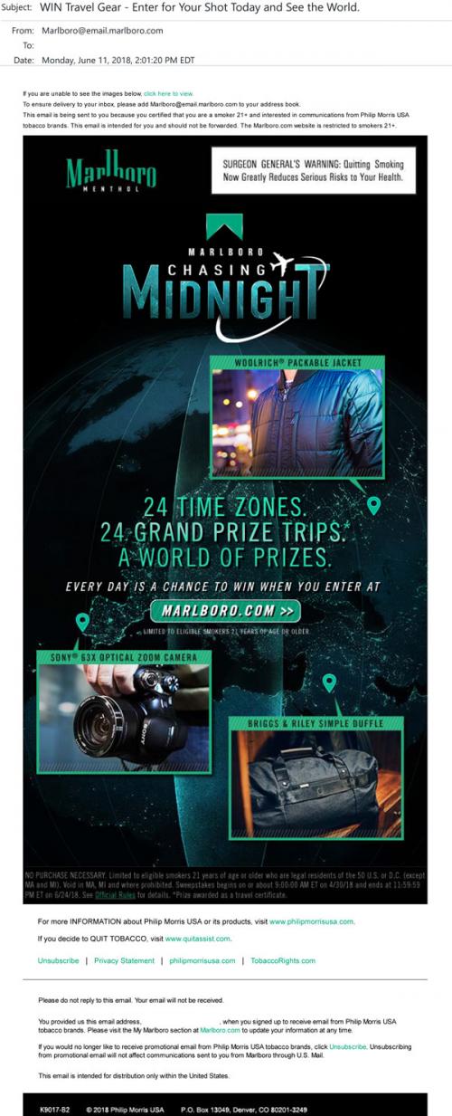 Email from Marlboro Menthol in June 2018 promoting the Chasing Midnight sweepstakes, including images of prizes offered and a link to the brand website to enter.