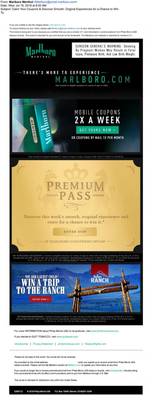 Email from Marlboro Menthol in July 2018 linking to claim coupons on the brand website, via mobile phone or direct mail. Also promotes the Premium Pass sweepstakes and a chance to win a trip to the Marlboro Ranch.