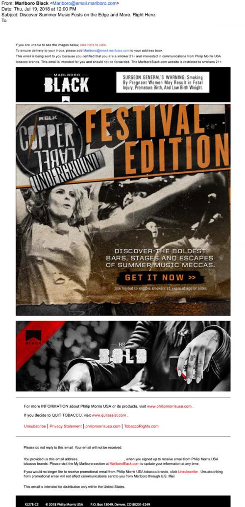 Email from Marlboro Black in July 2018 with a feature on music festivals from the Copper Label: Underground section.