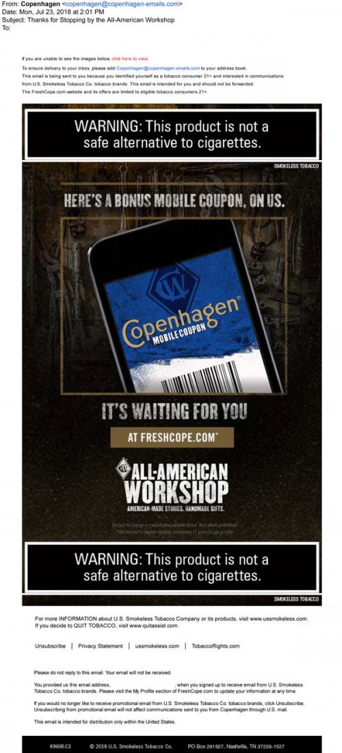 Email from Copenhagen in July 2018 offering a bonus mobile coupon as thanks for participating in the All-American Workshop sweepstakes.