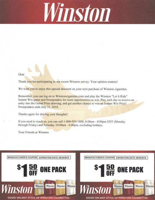 Direct mail from Winston received in July 2018 that thanks the recipient for participating in a recent brand survey. Includes coupons and a reminder to play the Let It Ride instant win game on the brand website.