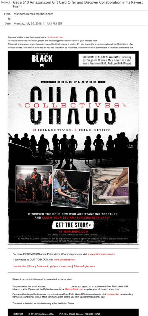Email from Marlboro Black in July 2018 promoting a new series about the Chaos Collectives, with an incentive of an Amazon gift card to check it out on the brand website.