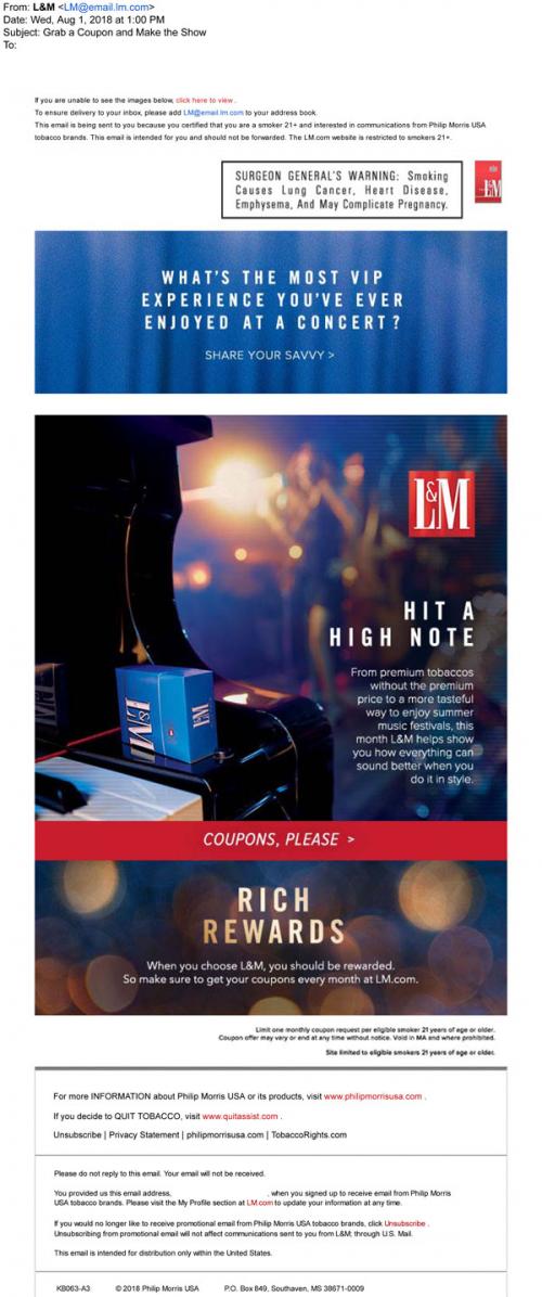 Email from L&M in August 2018 offering coupons to be claimed on the brand website. Also invites the recipient to participate and share concert experiences and get music festival tips.