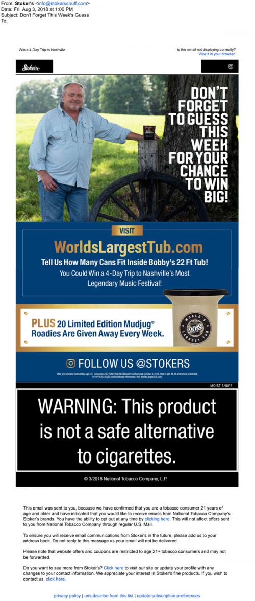 Stoker's email from August 2018 promoting the World's Largest Tub sweepstakes, with a link to the contest site to enter. Also mentions the brand's presence on social media.