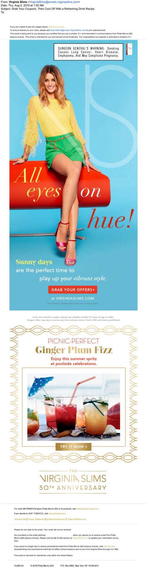 Email from Virginia Slims in August 2018 linking to the brand website to claim monthly coupons and check out a summer drink recipe.