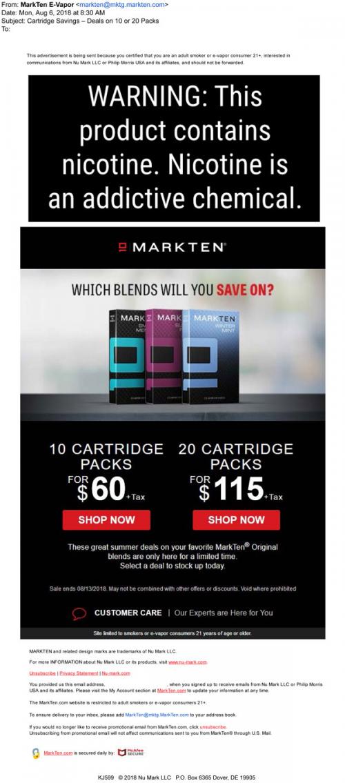 Email from MarkTen in August 2018 promoting a cartridge sale on the brand website, with an emphasis on flavors.