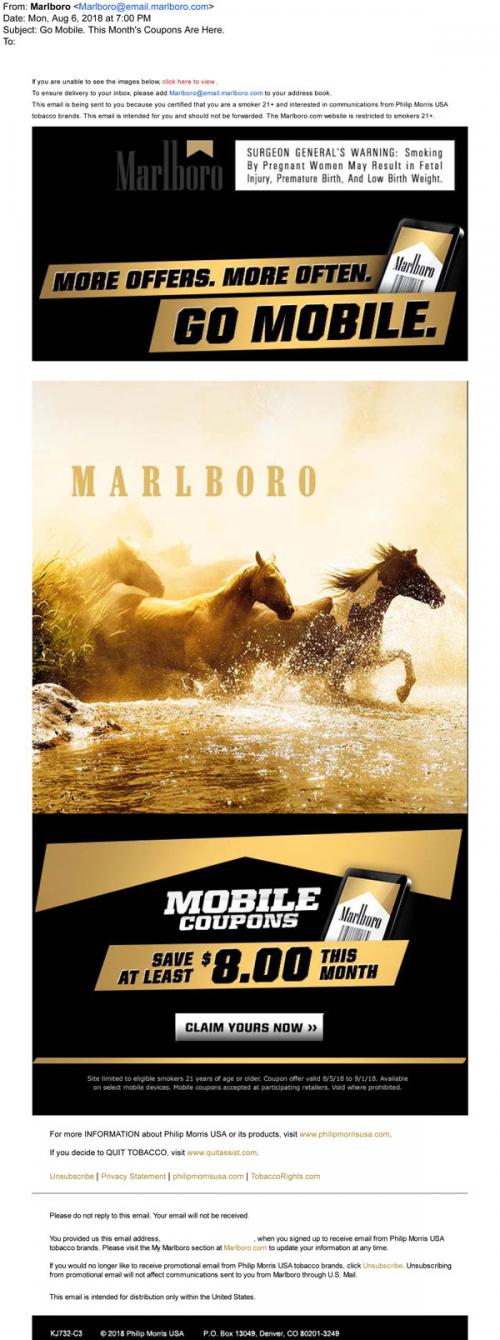 Marlboro Gold email from August 2018 promoting mobile coupons, with a link to the brand website to claim them.