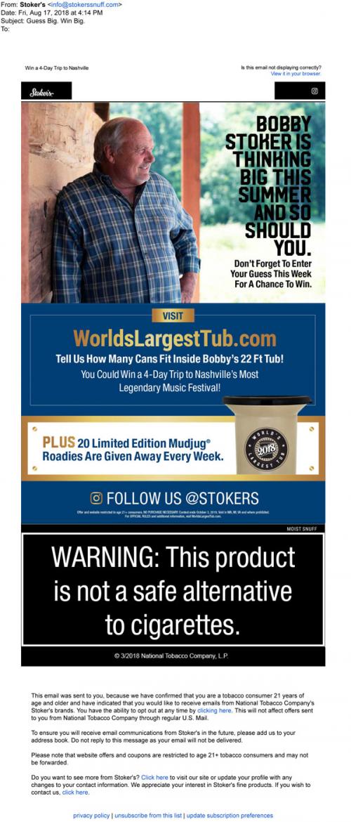 Email from Stoker's in August 2018 reminding the recipient to make a weekly guess to enter the World's Largest Tub contest. Provides a link to the contest site to win a trip to a Nashville music festival, or limited edition mud jugs.
