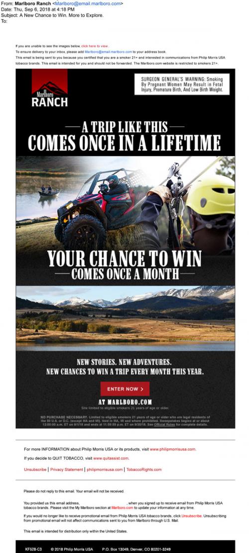 Email from Marlboro in September 2018 promoting the chance to win a Marlboro Ranch trip once a month. Provides a link to enter on the brand website.