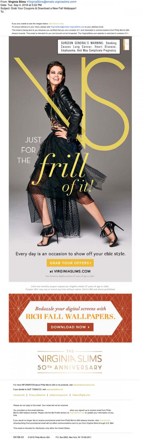 Email from Virginia Slims in September 2018 providing a link to claim monthly coupons on the brand website and download a new fall-themed digital wallpaper.