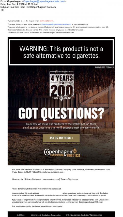 Email from Copenhagen in September 2018 providing a link to the brand website to send in questions to representatives of the brand, with a plan to publicly answer one every month in celebration of the 4 Years to 200th anniversary.