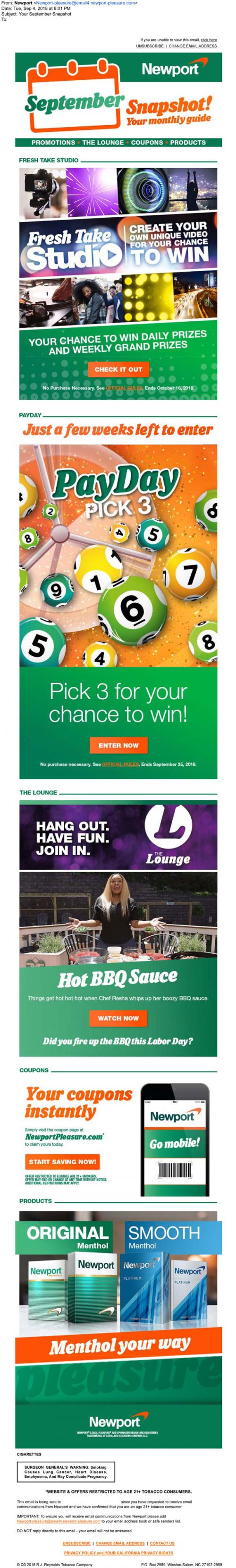 Email from Newport in September 2018 with a snapshot update from the brand for the month. Promotes the Fresh Take Studio sweepstakes and the PayDay Pick 3 game, as well as a BBQ sauce recipe for Labor Day on the Lounge feature. Reminds the recipient to claim mobile coupons and includes images of their original and platinum menthol products.