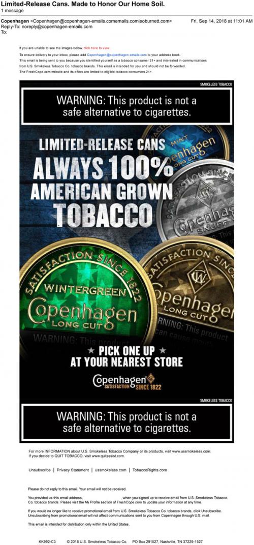 Copenhagen email in September 2018 promoting their new limited edition stars and stripes cans to celebrate their 100% American grown tobacco.