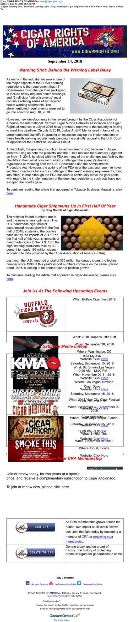 Email from the Cigar Rights of America in September 2018 describing the delay in the FDA's regulations regarding premium cigar warning labels on packages, as well as a link to an article describing economic success in the industry. Also links to upcoming cigar events and media, and solicits for memberships and donations.