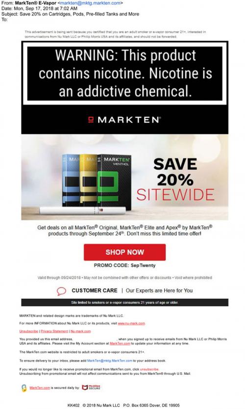 MarkTen email received in September 2018 that promotes a sale on the brand website on all products. Includes a promo code to use when shopping.