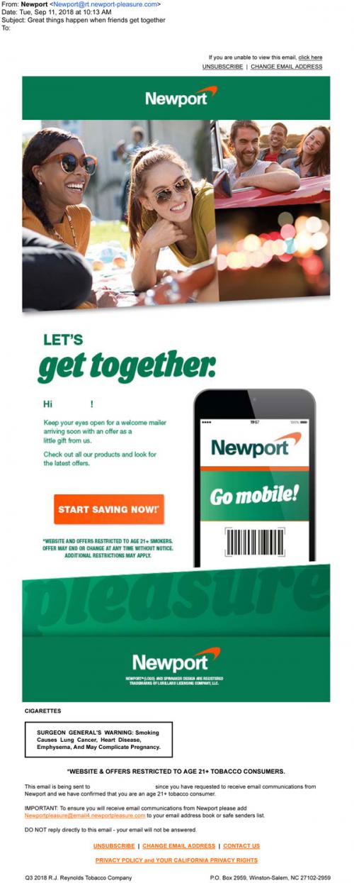 Email from Newport in September 2018 welcoming a new customer, promising a direct mail offer soon and including a link to the brand website. Reminds the customer to go mobile for coupons.