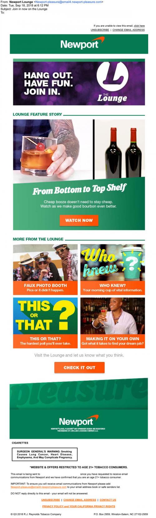 Email from Newport in September 2018 highlighting The Lounge feature and some things that can be found on the brand website, like lifestyle articles, tips, and polls to participate in.
