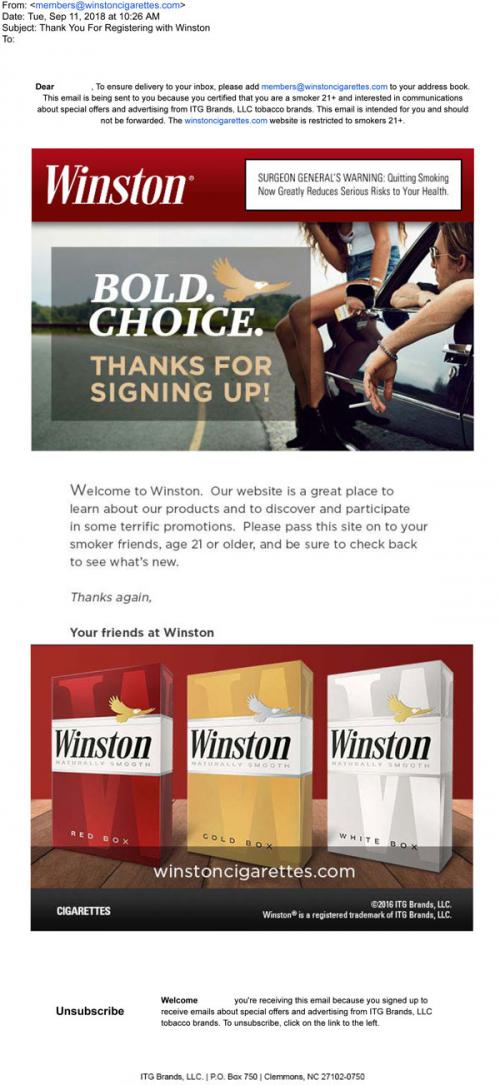 Email from Winston in September 2018 thanking the recipient for signing up for notifications through their brand website. Reminds them to pass the site onto their smoker friends, and to visit again.