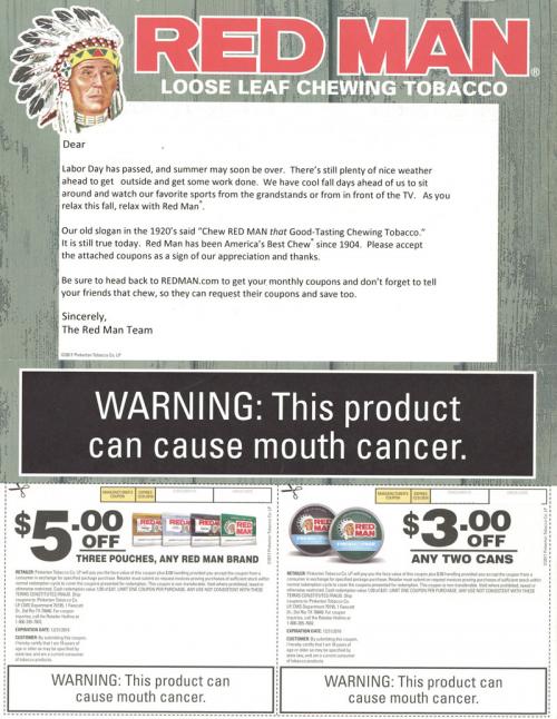Direct mail received from Red Man in September 2018 welcoming the end of summer and the passing of Labor Day. Reminds the recipient to relax this fall with their products.